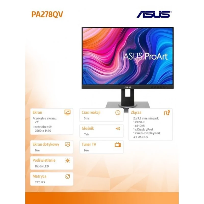 Monitor 27 cali ProArt PA278QV IPS WQHD HDMI DP mDP HUB USB sRGB: 100%