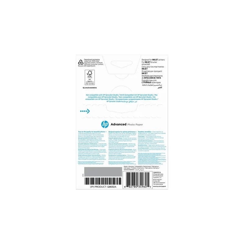HP Advanced Glossy Photo Pa, Q8692A, foto papier, bez marginesu typ połysk, zaawansowany typ biały, 10x15cm, 4x6", 250 g/m2, 1