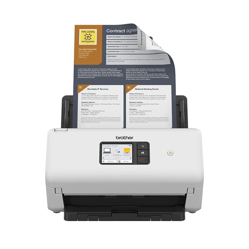 Model ADS-4500W został zaprojektowany z naciskiem na prostotę użytkowania bez kompromisów w zakresie funkcjonalności. Kolorowy ekran dotykowy o przekątnej 7,1 cm zapewnia intuicyjny dostęp do wszystkich funkcji urządzenia, umożliwiając utworzenie do 20 konfigurowalnych skrótów dla najczęściej używanych operacji skanowania. Urządzenie obsługuje automatyczne uruchamianie skanowania oraz oferuje zaawansowane funkcje przetwarzania obrazu, w tym automatyczną redukcję pionowych smug i efektu mory. Wsparcie dla aplikacji Brother Mobile Connect oraz skanowania z wykorzystaniem usługi AirPrint zapewnia pełną kompatybilność z urządzeniami mobilnymi i systemami Apple.