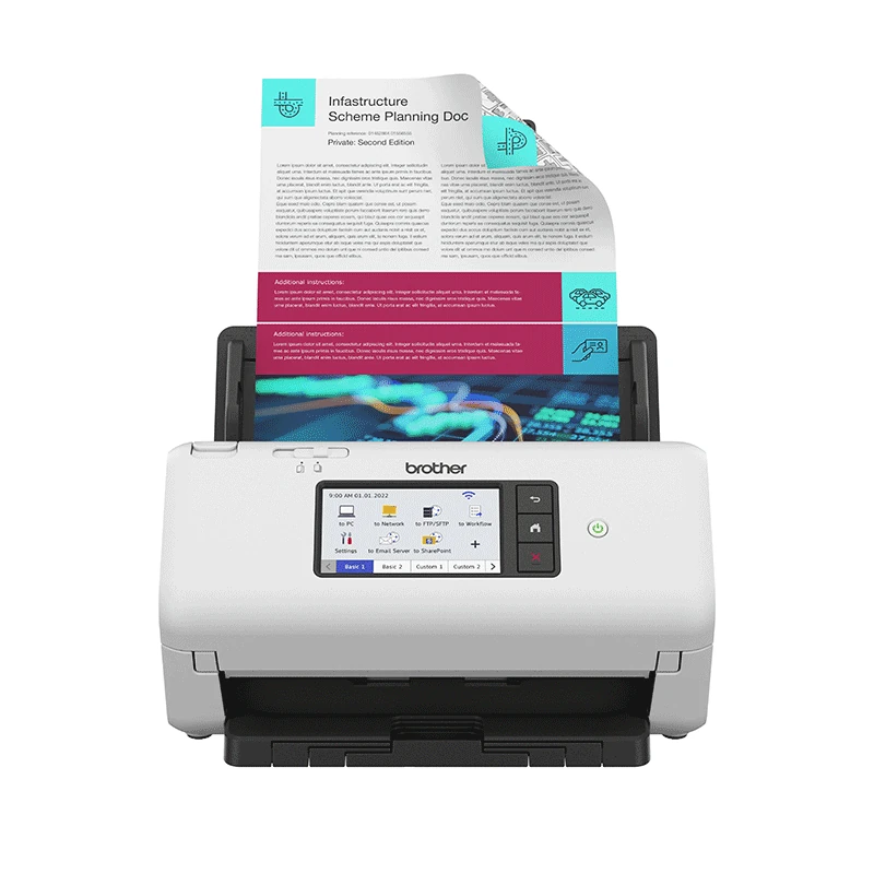 Brother ADS-4700W to najnowocześniejszy model z serii biurkowych skanerów dokumentów, zaprojektowany z myślą o firmach wymagających złożonych przepływów pracy i zaawansowanych funkcji zarządzania dokumentami. Model ten łączy w sobie wysoką wydajność skanowania z intuicyjnym interfejsem użytkownika - dużym ekranem dotykowym o przekątnej 10,9 cm oraz 56 konfigurowanymi skrótami. Dzięki pełnej łączności bezprzewodowej i przewodowej, ADS-4700W stanowi idealne rozwiązanie dla organizacji potrzebujących bezpiecznego udostępniania dokumentów zespołom pracującym zarówno w biurze, jak i zdalnie.