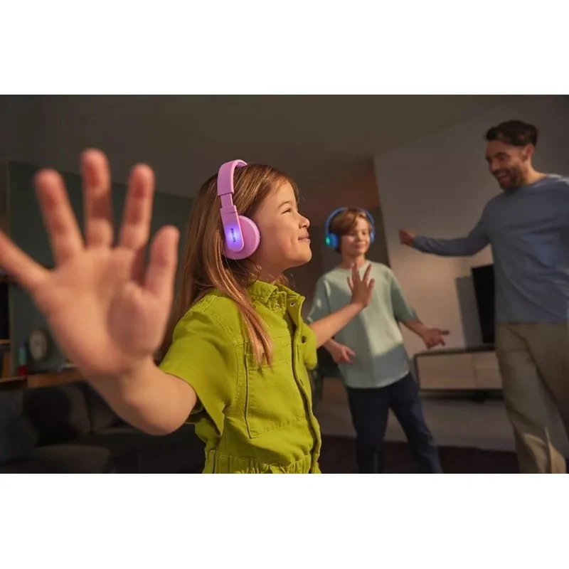 Te wytrzymałe, elastyczne słuchawki nauszne podkreślają własny styl! Panele w nakładkach nausznych są wyposażone w kolorowe podświetlenia, a głośność jest ograniczona do 85 dB. Rodzice mogą sterować głośnością i czasem odtwarzania za pomocą aplikacji Philips Headphones.