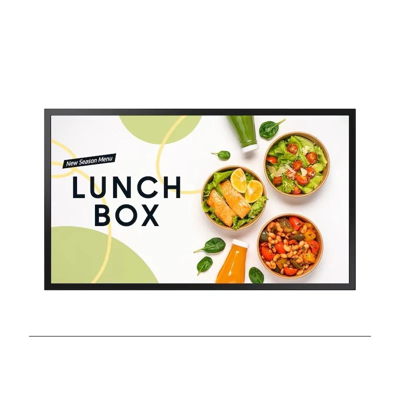 Ultracienki ekran Window Signage o grubości 45,6 mm sprawia, że OM32DX jest najcieńszy w swojej klasie. Jego cienka konstrukcja pozwala na instalację w różnych środowiskach, zapewniając estetyczną przestrzeń. Elegancki design wpływa na doskonałe wrażenia wizualne, płynnie integrując się z otoczeniem biznesowym.